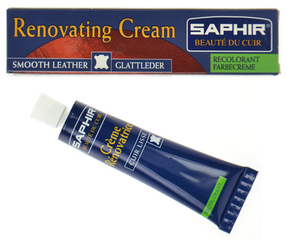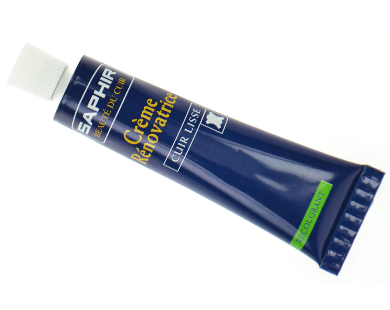 Saphir Crème rénovatrice leather renovating cream with its replenishing, recolouring and renovating pigments this high pigment cream restores leather grain in the event of scratches, discolouration and wear. Easy to apply, the colour withstands wear and water contact. Colours can be blended to obtain the perfect shade. 25ml tube. Each. Remarks : - Complementary to shoe polish but no replacement. - No colour discharge. - Perfect for occasional renovation, not intended for regular care. - It is possible to mix the colours together. Test result on a piece of paper and let dry, because the shade will get slightly darker.