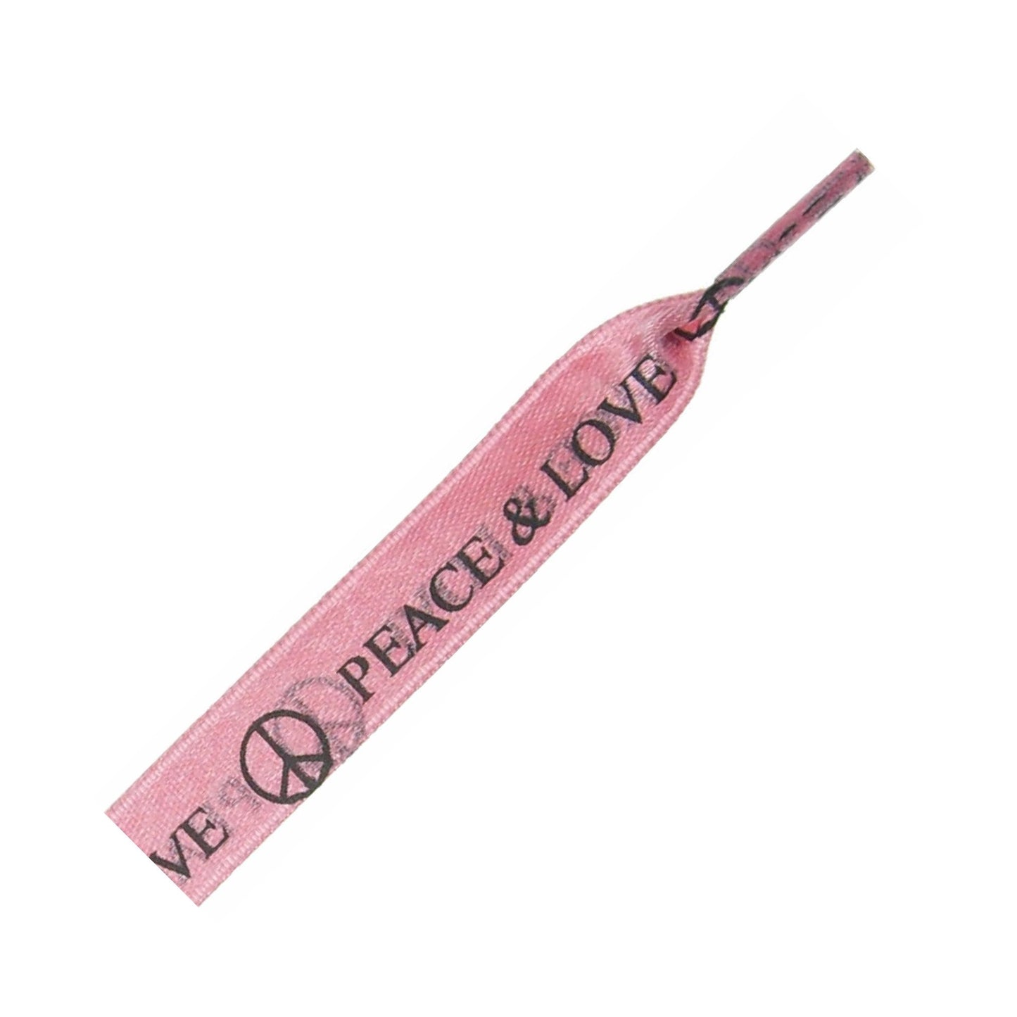 Pink satin ribbon Shoe Laces with 'Peace & Love' and the CND logo printed in black. Flat profile 100cm. 12mm wide. Per pair.