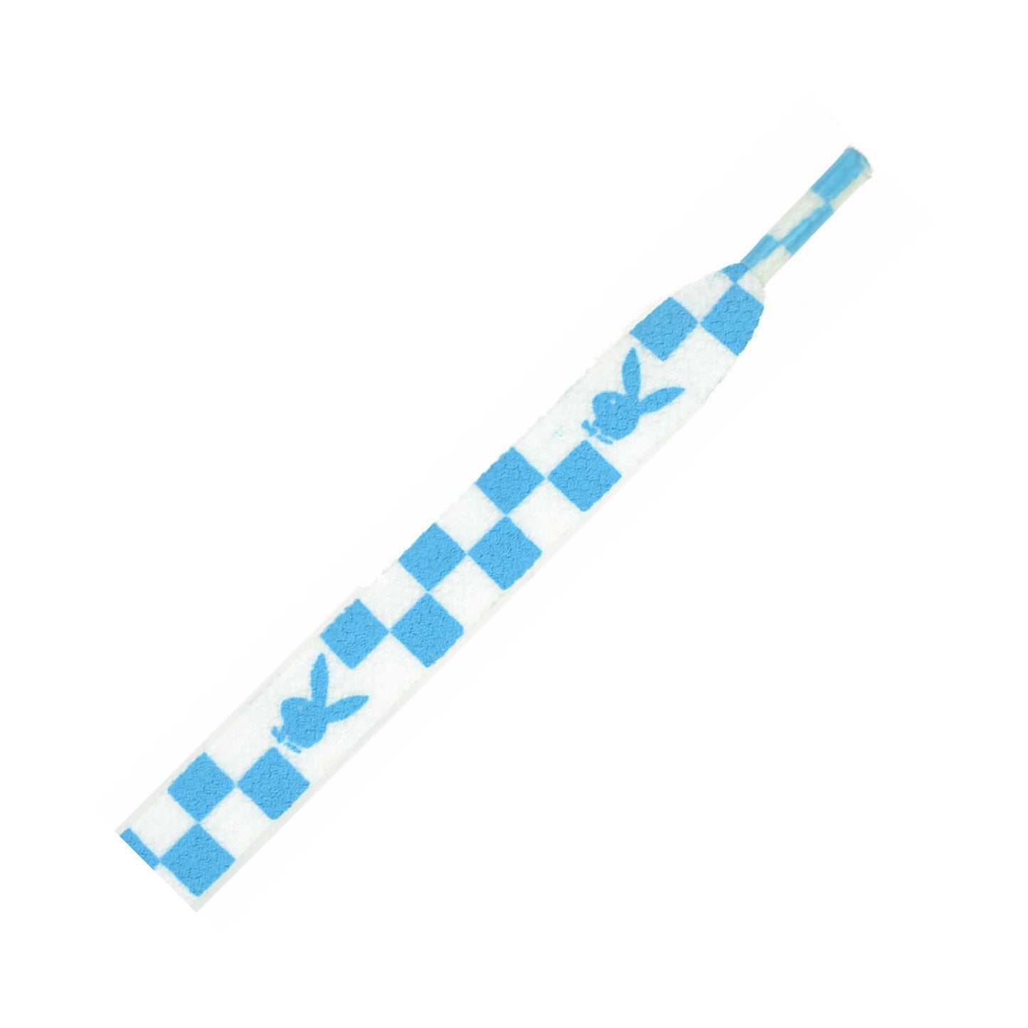 110cm flat Shoe Laces with blue and white chequer pattern with bunny head logo. Flat profile. 10mm wide. Per pair.