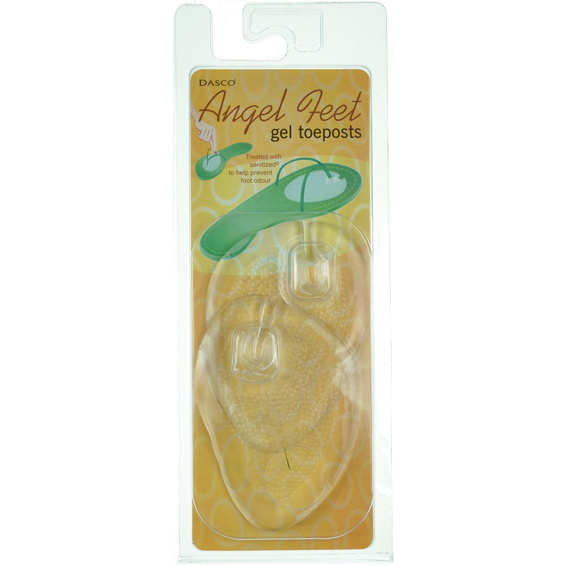 Angel Feet Gel Toeposts "invisible" gel cushions offer gentle protection for toes and cushioning for the balls of your feet. Suitable for all flip flops and toe thong style shoes and sandals. Each pad weighs 12gm; Maximum dimensions: 9.5cm long x 7.5cm wide x 1.5cm high. 1 pair.