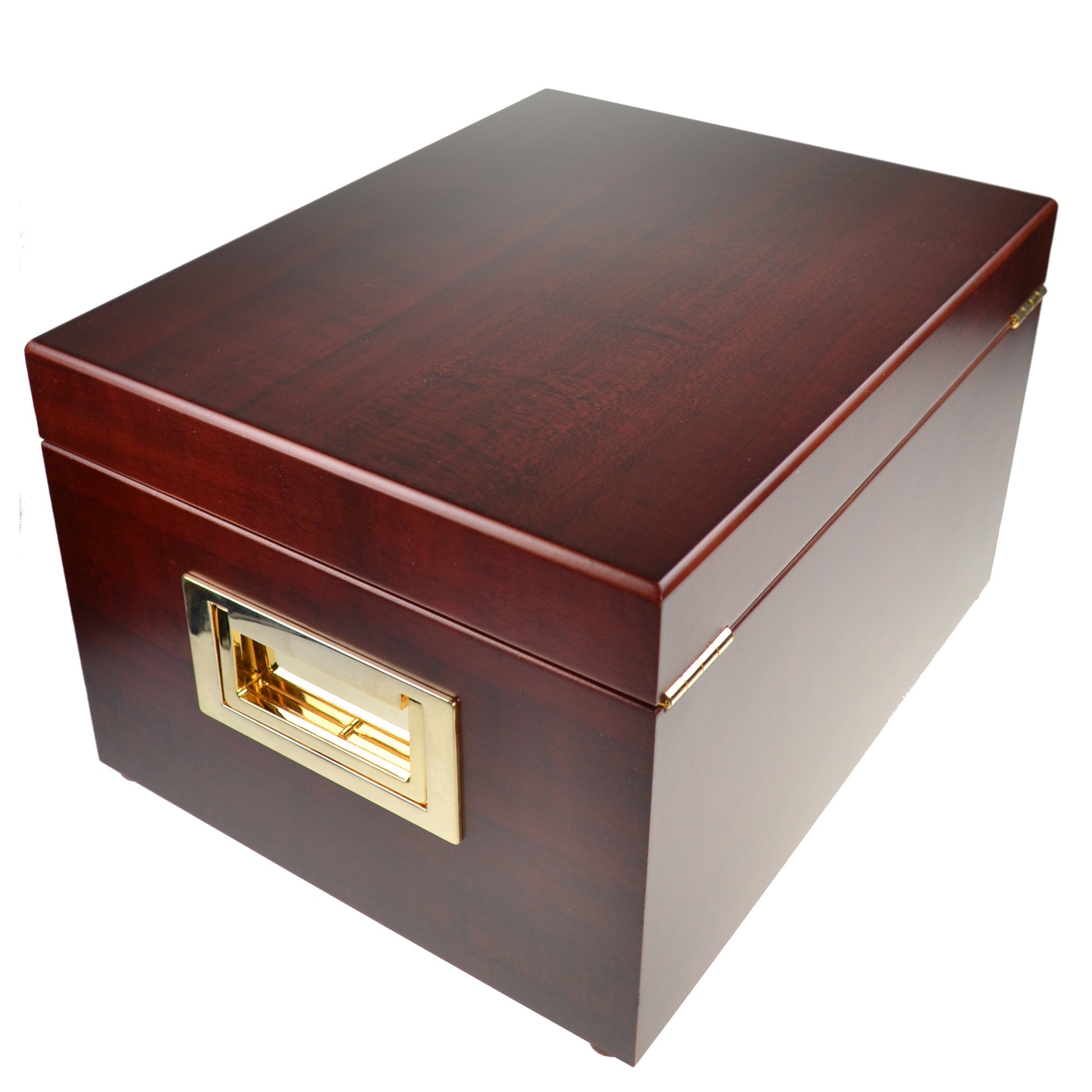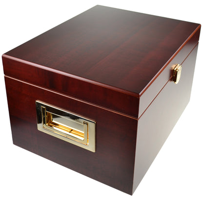 Cherry wood valet box with brass handles. Made of wood veneer with brass plated fittings. Box exterior dimensions: 16.5cm x 27.5cm x 21.5cm (H x W x D)