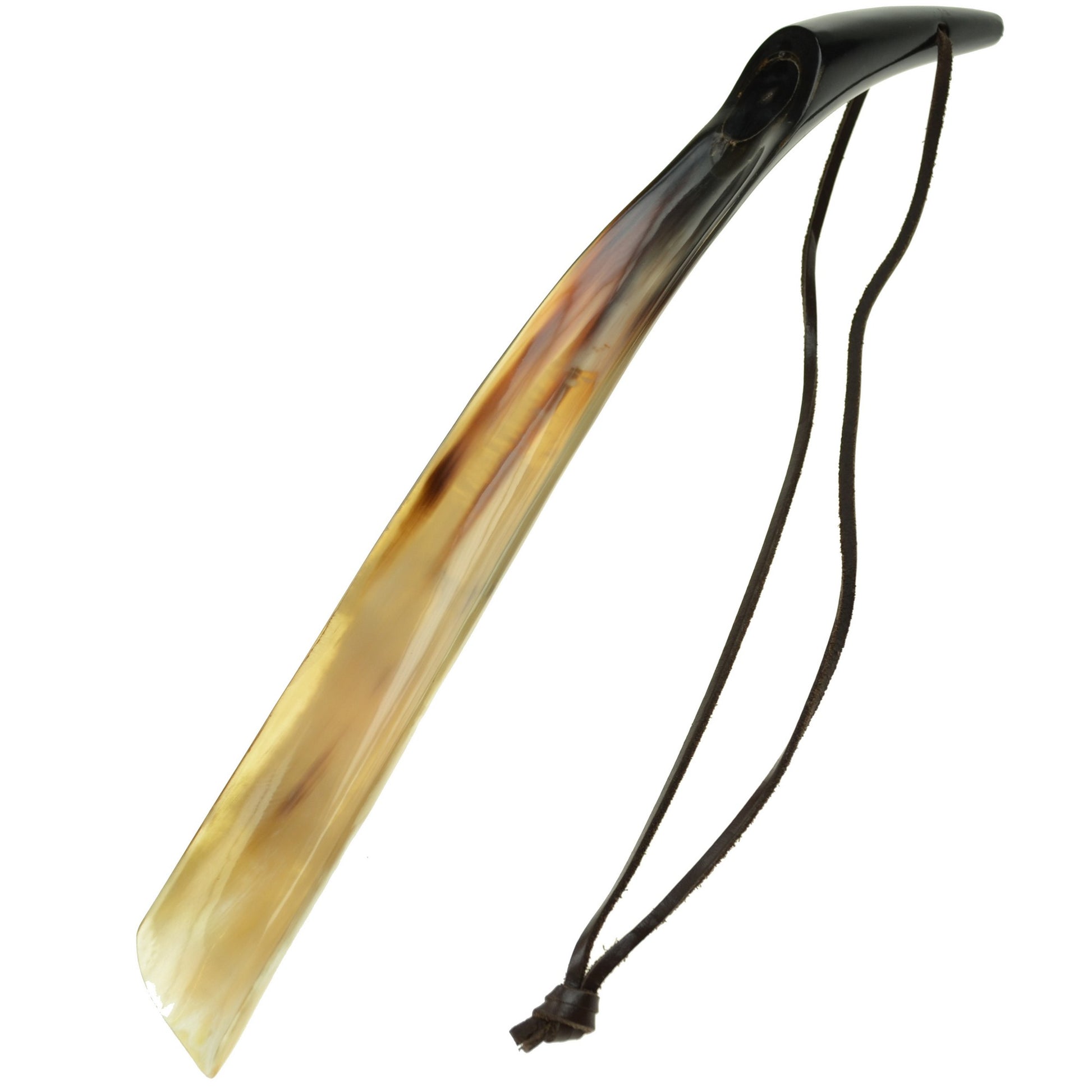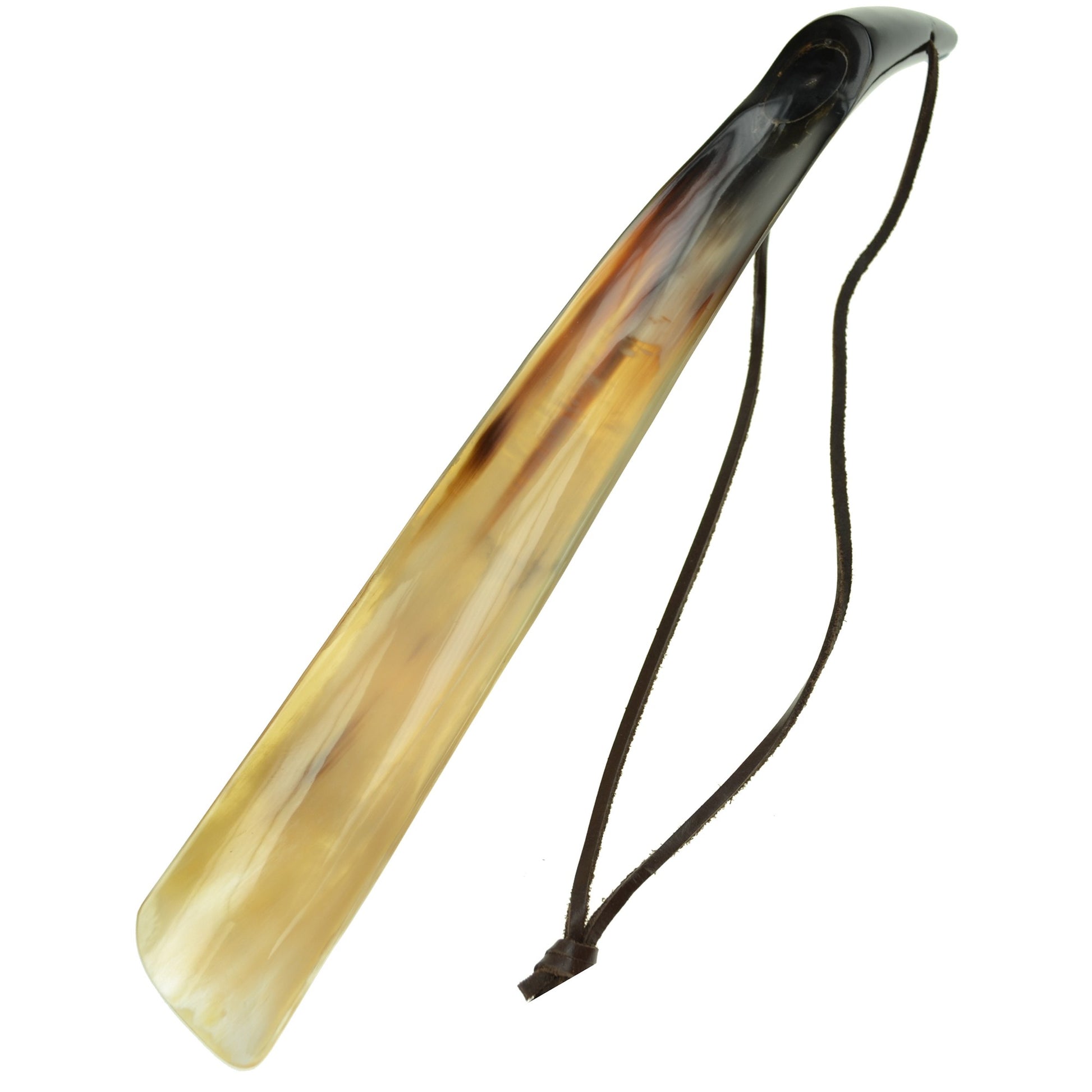 Dasco shoe horn made from polished real horn with leather thong through tip end of the horn. Real horn is a beautiful and tactile material which is immensely strong. Length is between 15" and 16" ; 38 - 41cm. Colours vary from shoe horn to shoe horn!